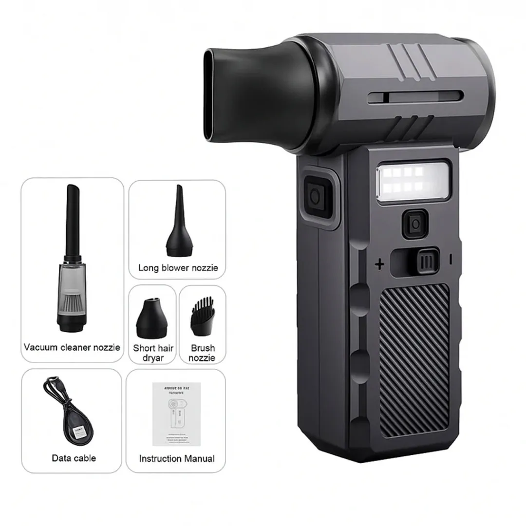 یکی از نقاط قوت مهم این محصول، مجموعه کامل لوازم همراه آن است. در جعبه دستگاه، کابل شارژ Type-C، سری خشککن کوتاه، سری خشککن بلند، سری برسدار مکش، لوله وکیوم، کاپ مکش، فیلتر داخلی و دفترچه راهنما قرار دارد. این یعنی کاربر برای شروع استفاده، تقریباً همه چیز را در اختیار دارد و نیازی به خرید جداگانه بسیاری از قطعات نخواهد داشت. تنوع نازلها نیز باعث میشود بتوانید دستگاه را برای کارهای مختلف بهکار بگیرید؛ از دمیدن باد متمرکز گرفته تا مکش ذرات ریز. این همراهی کامل، یکی از دلایلی است که F028 را به یک پکیج حرفهای تبدیل میکند، نه صرفاً یک ابزار تکی.
