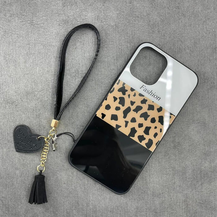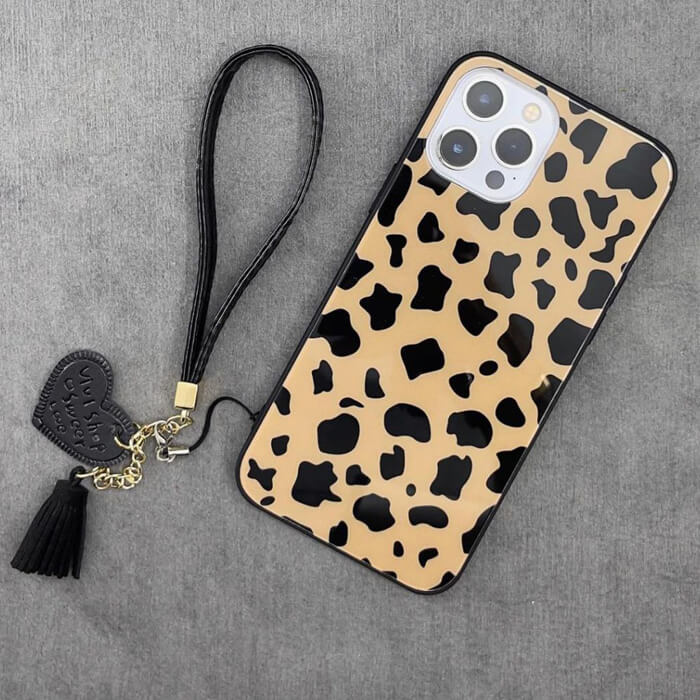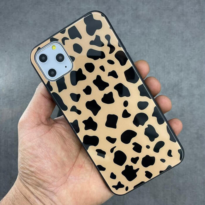 قاب آیفون پلنگی پشت گلس+ بند ست