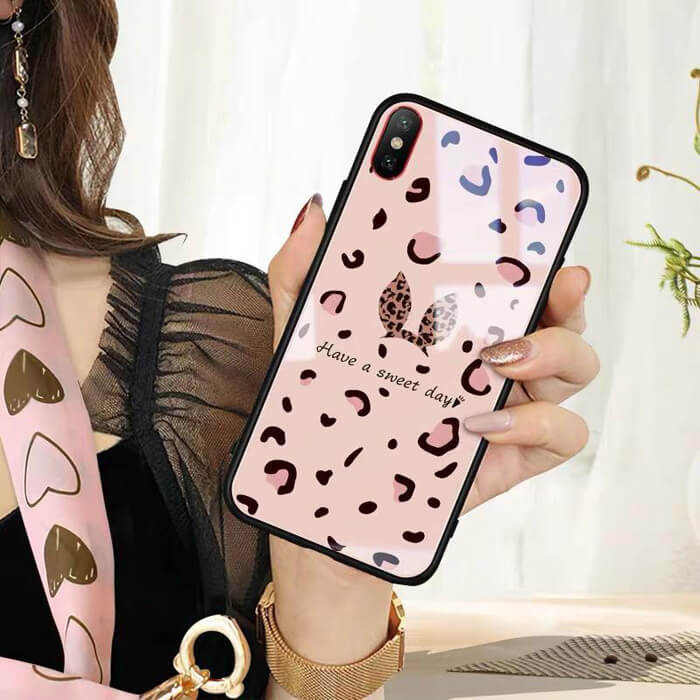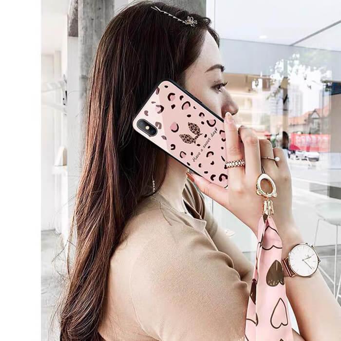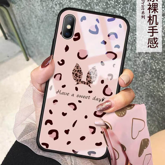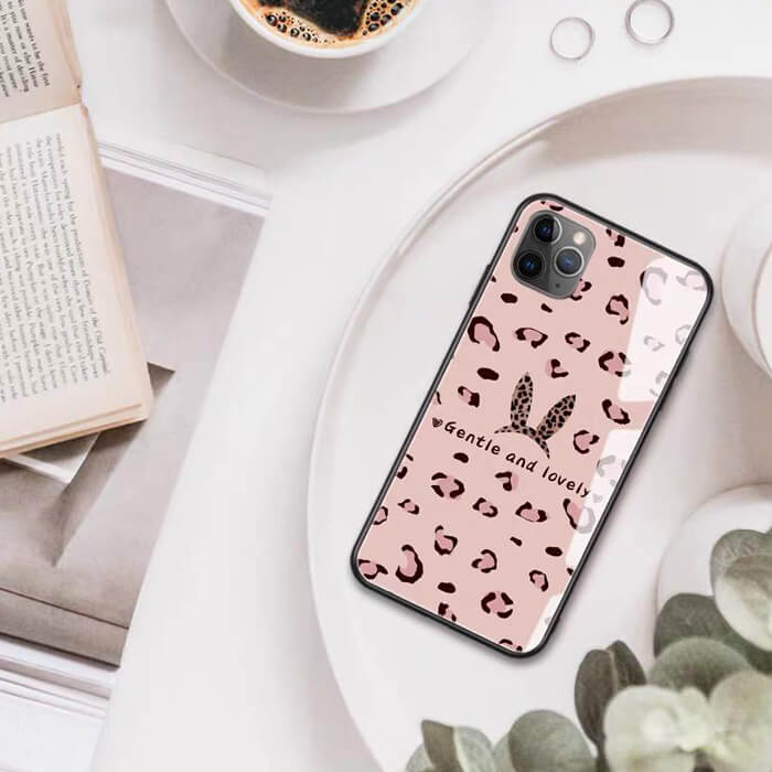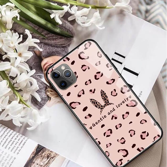 قاب موبایل آیفون پلنگ صورتی خرگوشی پشت گلس+بند ست