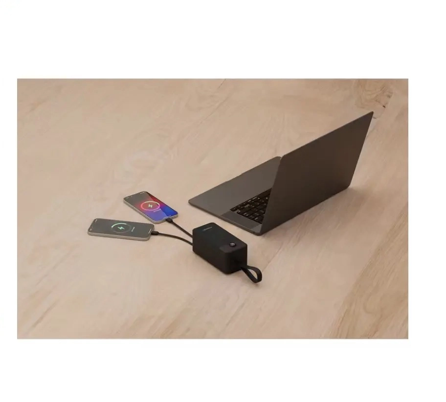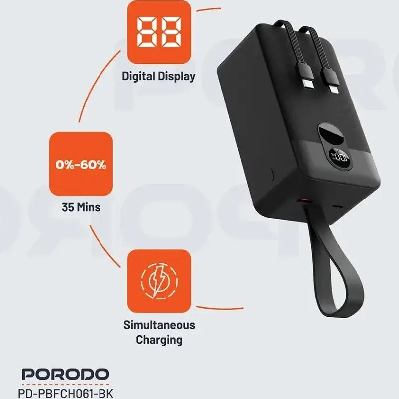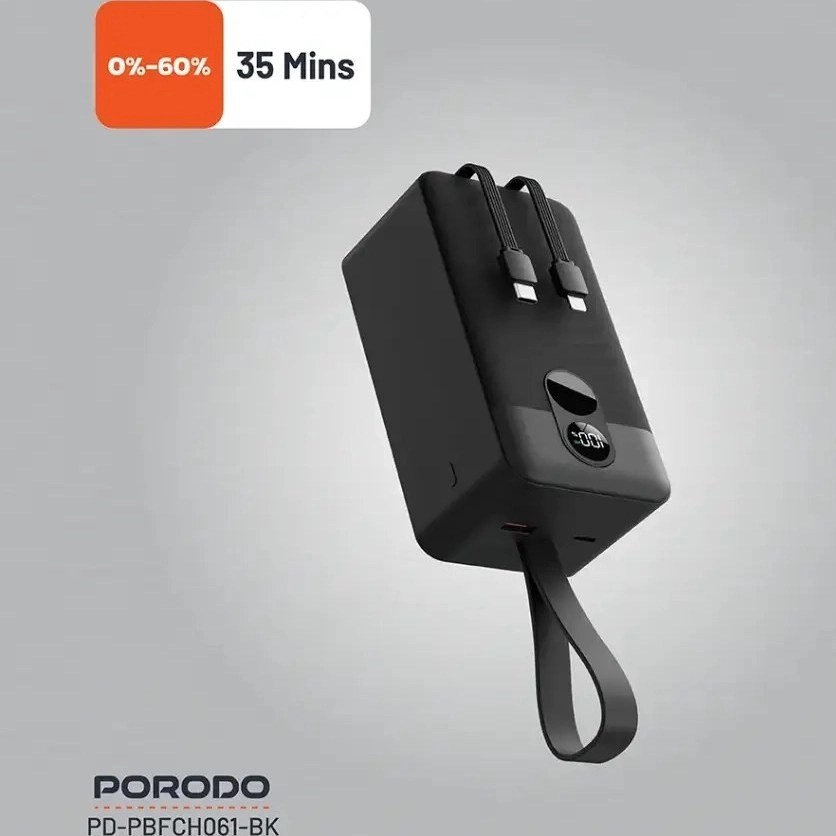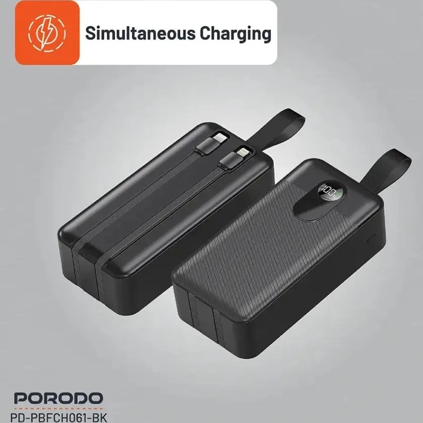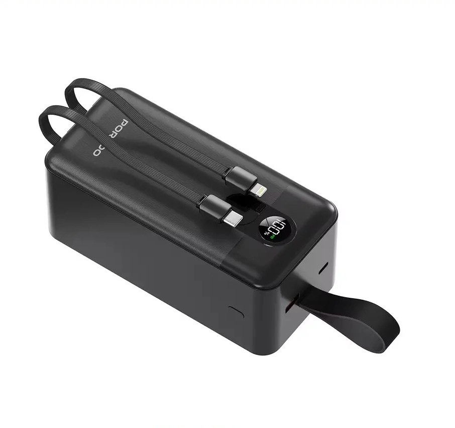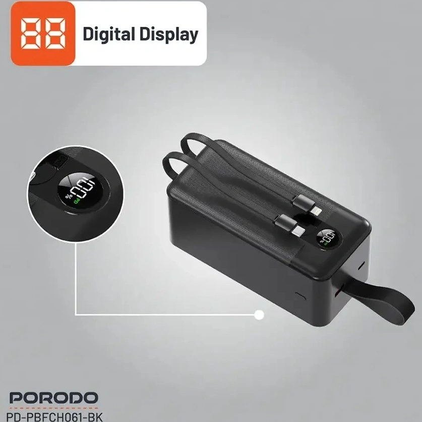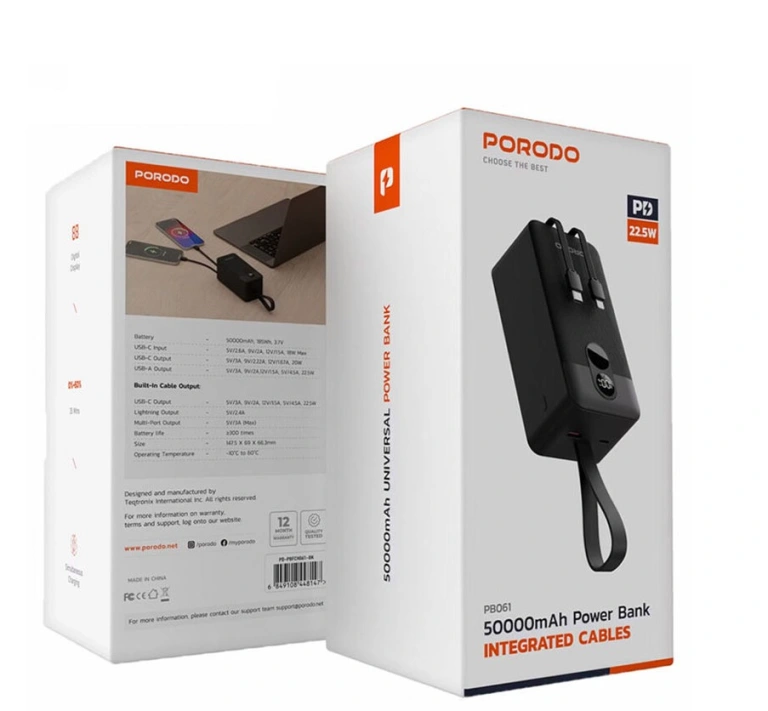 پاوربانک پرودو ۵۰۰۰۰ دارای دو کابل داخلی بسیار مقاوم است که شما را از حمل کابل اضافی بی‌نیاز می‌کند. این کابل‌ها شامل یک خروجی تایپ‌سی (Type-C) با توان بالا و یک خروجی لایتنینگ (Lightning) برای گوشی‌های آیفون هستند.